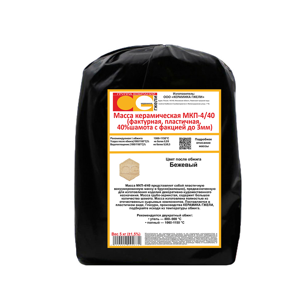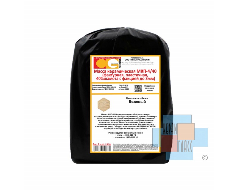 Масса МКП-4/40 представляет собой пластичную вакуумированную массу в бруске(валюшке), предназначенную для изготовления изделий декоративно-художественного назначения. Масса грубо-зернистая, содержит большое количество шамота. Масса изготовлена полностью из отечественных сырьевых компонентов. Поставляется в пластичном виде. Глазури, производства КЕРАМИКА ГЖЕЛИ, подбирайте исходя из температуры обжига.